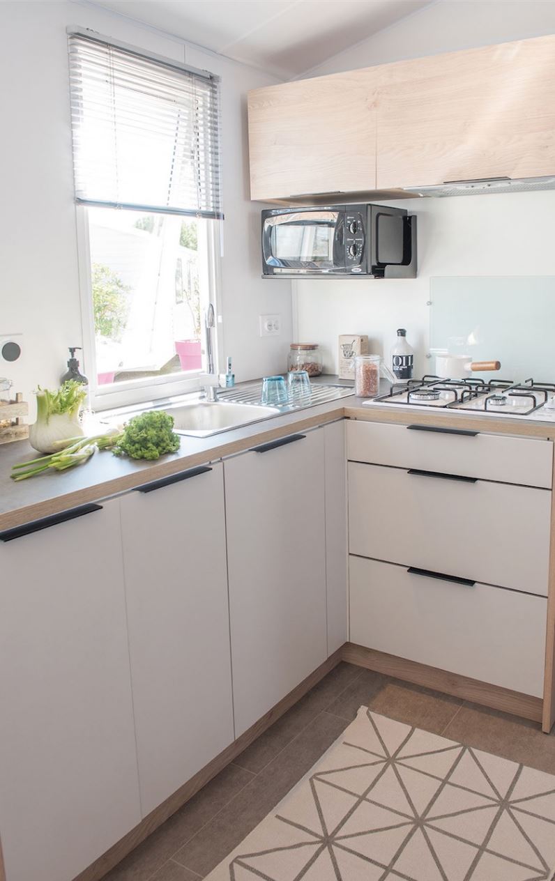 Superficie : 20 m² – Mobil home récent : 1 chambre avec 1 lit double – 1 séjour avec 1 canapé – Coin cuisine – 1 salle d’eau et 1 wc – Terrasse couverte