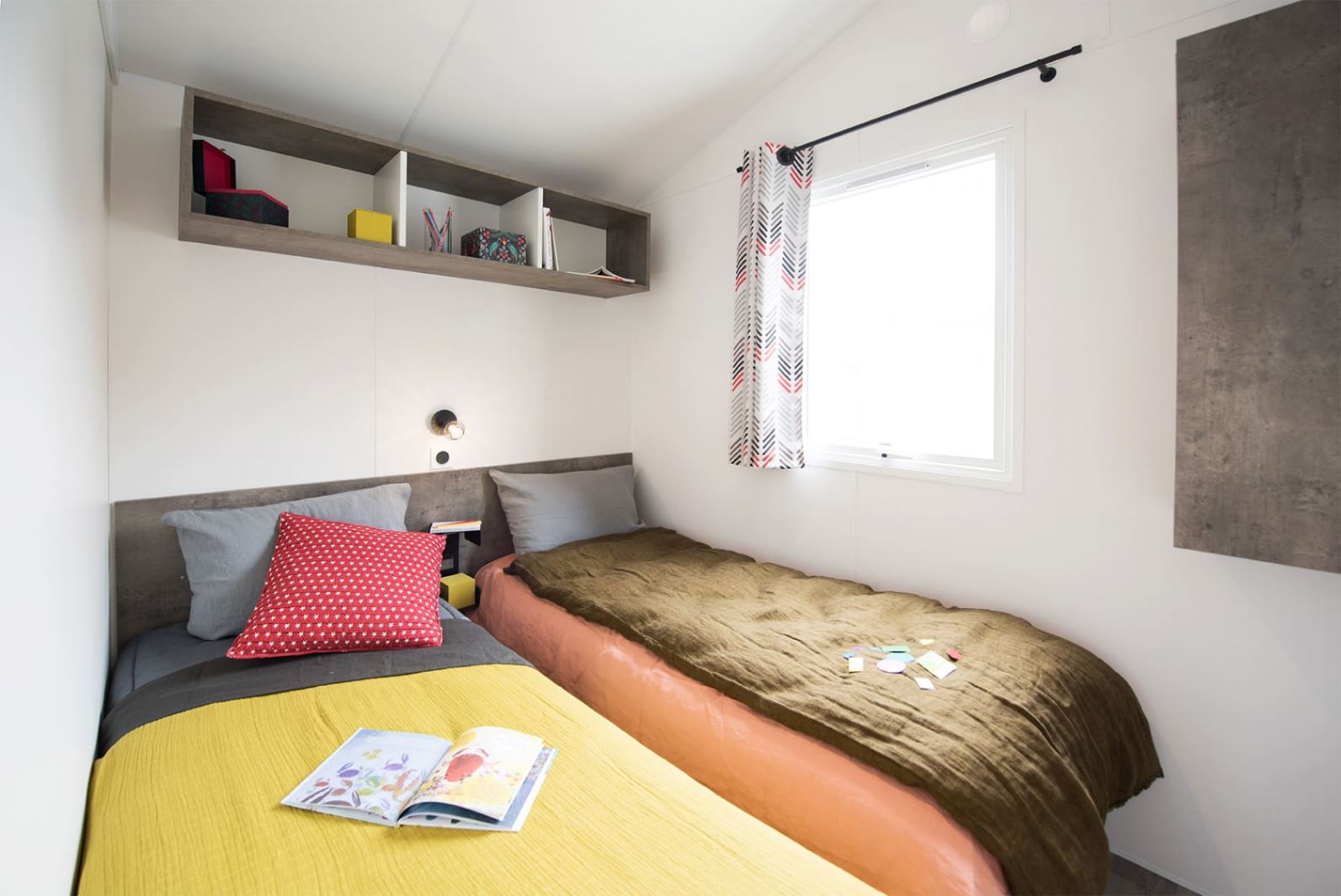 Intérieur style loft – Mobil Home premium 35 m2 – 3 chambres : 1 chambre avec 1 lit double (160) et 2 chambres avec 2 lits simples (80) – Cuisine avec ilôt central – Douche XXL – Coin canapé – Idéal pour les familles nombreuses ou pour un séjour entre amis.