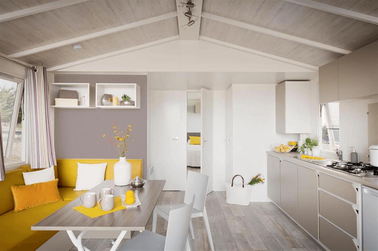 Mobil Home 32.4 m2 – 2 chambres : 1 chambre avec 1 lit double (160) et 1 chambre avec 2 lits simples (80) – 1 séjour avec coin canapé – Coin cuisine – 1 salle d’eau et 1 wc