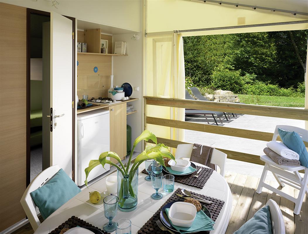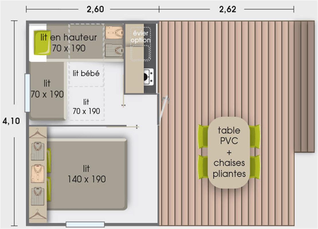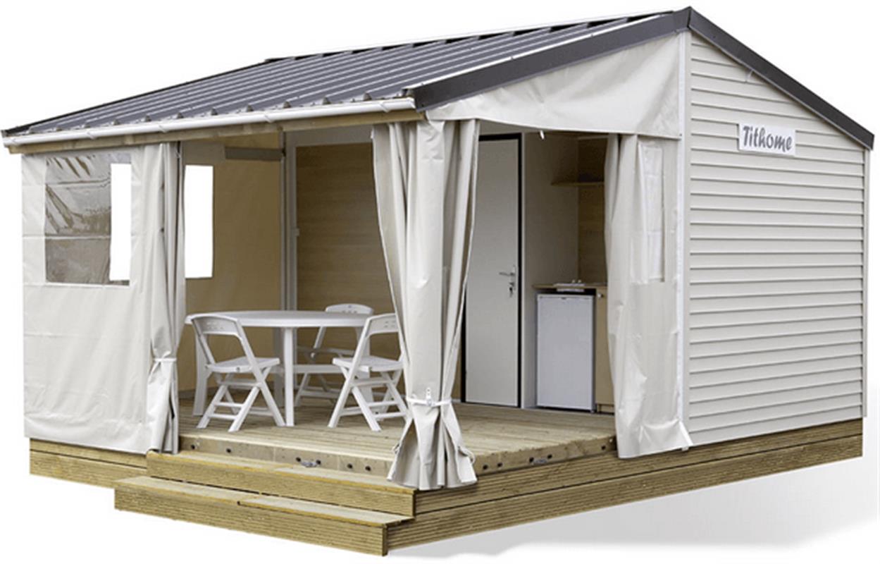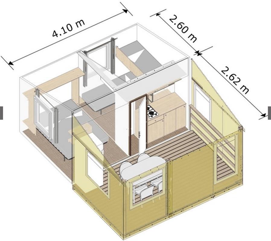Superficie totale : 20 m² – Bungalow toilé sans sanitaire – “kitchenette” : frigo, 2 feux gaz, micro-onde, table, vaisselle et nécessaire de cuisine, cafetière à filtre – 1 chambre avec 1 lit de 140, 1 chambre avec 3 lits de 80. Pas de chauffage.