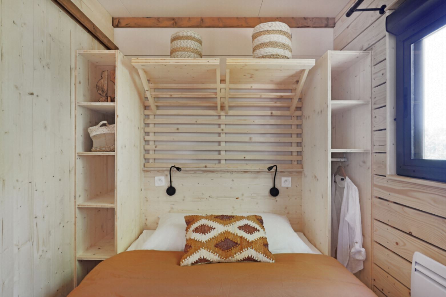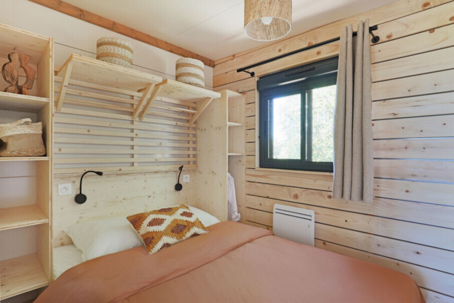 Ce chalet avec ses deux chambres, peut accueillir 5 personnes, une chambre parentale (140X200 cm), une chambre avec 3 couchages (80 x 200 cm), dont un lit superposé jusqu’à 50kg (adapté pour un enfant mais pas pour un adulte)