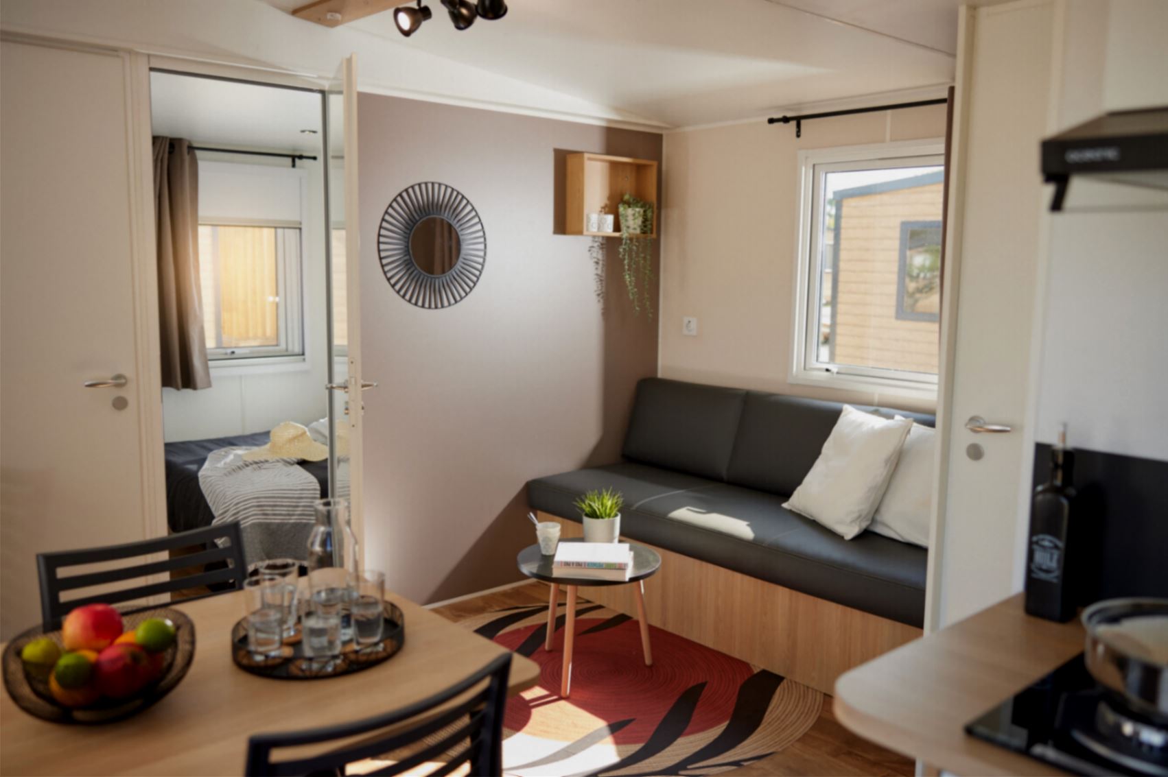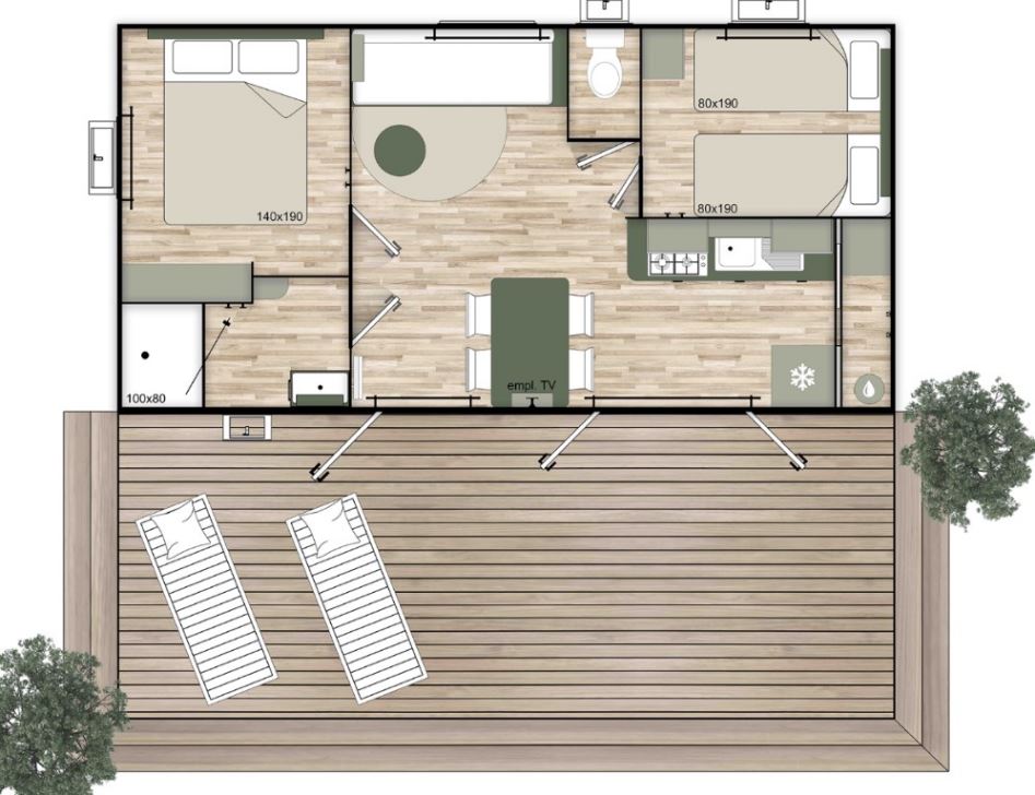 Ce Mobil-home neuf, avec climatisation réversible, offre une belle surface de près de 30 m2, avec un agencement très fonctionnel.